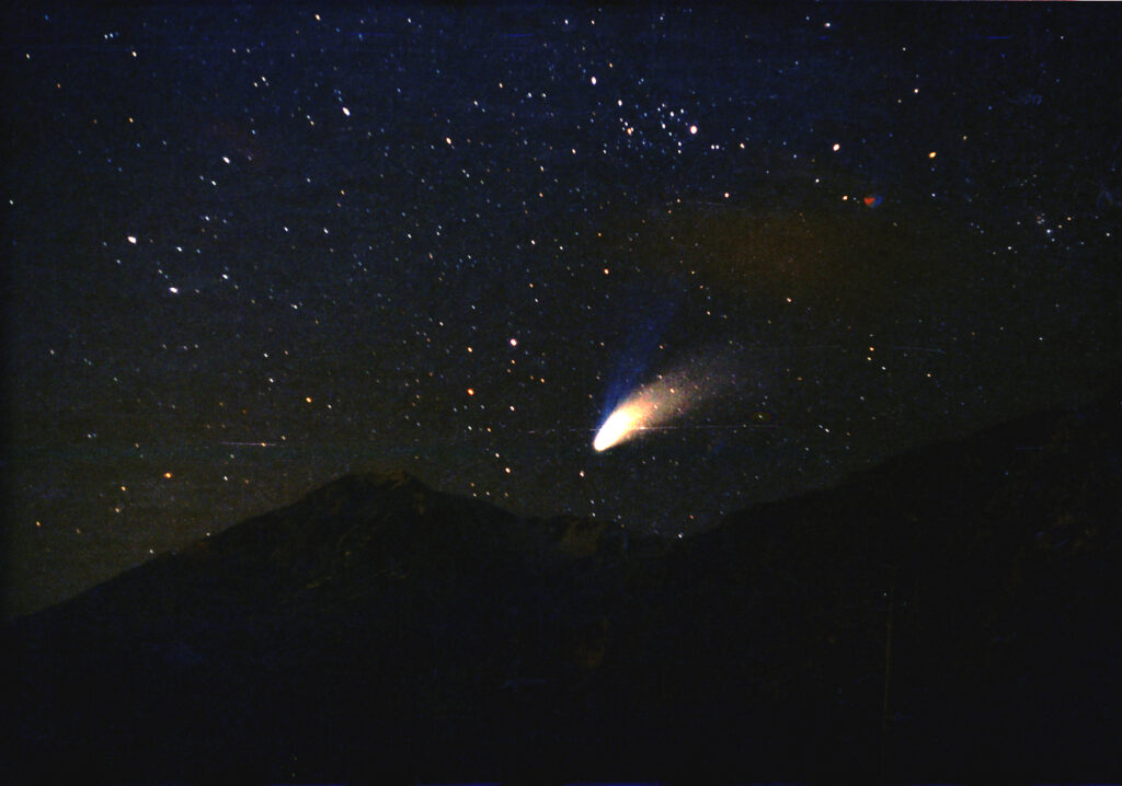 Tanto per capirci, quella che segue è una fotografia su pellicola della Hale-Bopp scattata da Avezzano (AQ), con una Zenit 12-XP e una manciata di secondi su una montatura equatoriale autocostruita con tavolette di legno e mossa a mano per compensare la rotazione della Terra! Fine aprile 1997, si vede il profilo del Monte Velino. Un vero spettacolo!