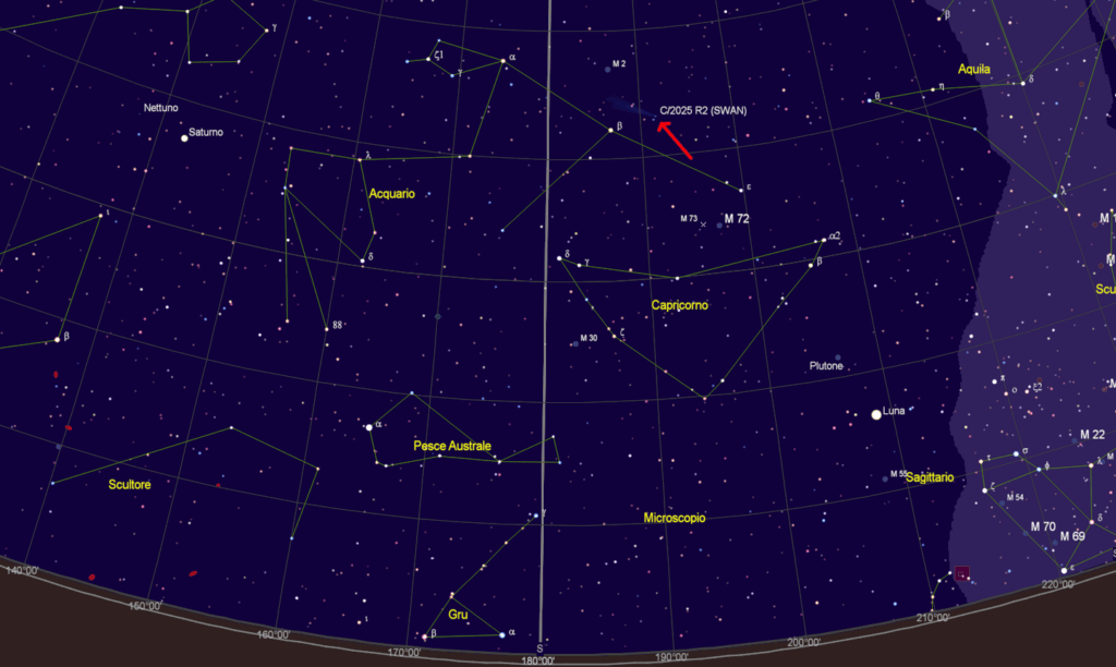 La cometa C/2025 R2 (SWAN) è stata scoperta da un astrofilo Ucraino, Vladimir Bezugly, l’11 settembre 2025, ha un periodo orbitale di poco meno di 800 anni (ci vorrà un po’ per tornare a vederla da queste parti!) e ha raggiunto la minima distanza dal Sole il giorno seguente la scoperta, raggiungendo circa 0,5 Unità Astronomiche dalla nostra Stella, 75 milioni di chilometri.